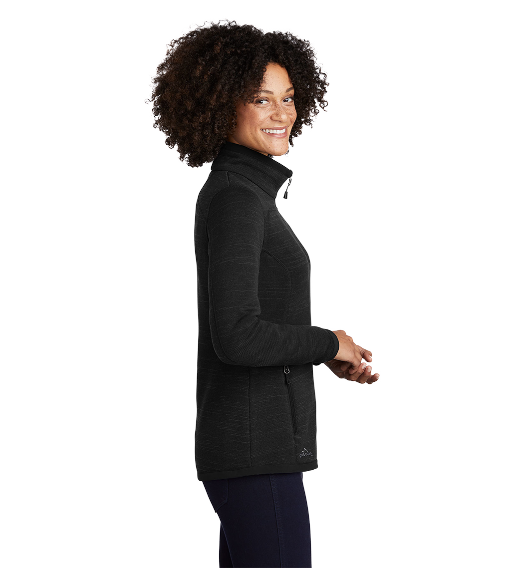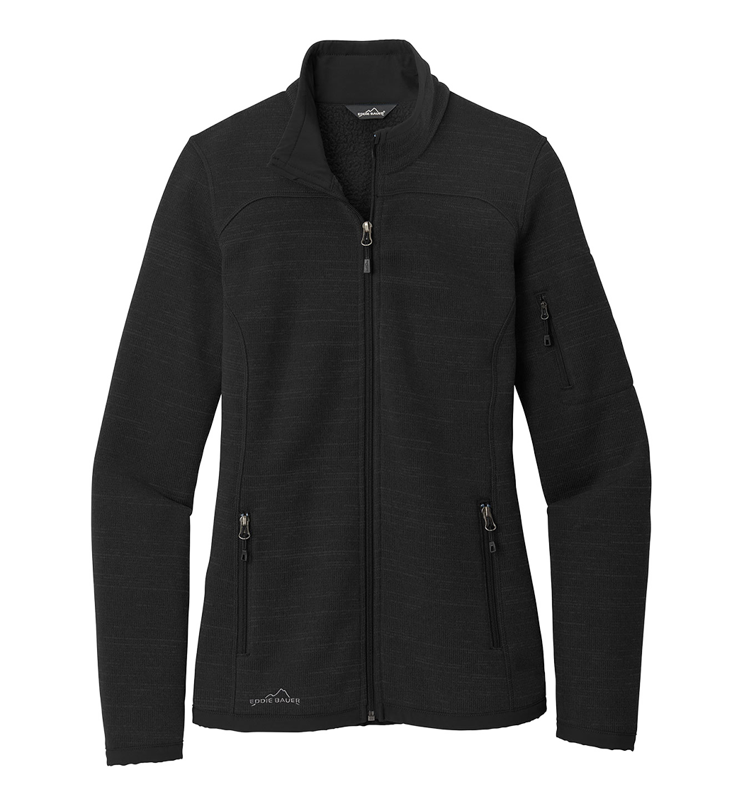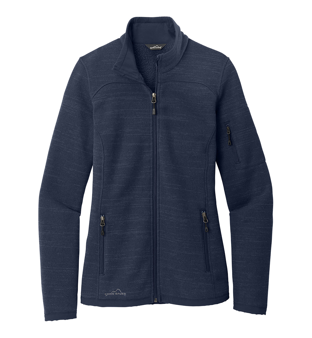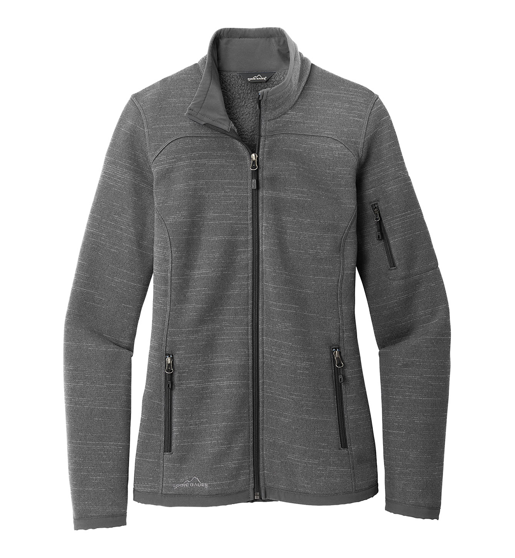 With an authentic outdoorsy lodge look, this refined sweater fleece delivers serious comfort. Smooth-faced and brushed-back for warmth, these anti-pill styles also have stretch for easy movement. Woven fabric details add sophistication. Cadet collar, exposed coil zippers, open cuffs and open hem. Front zippered pockets, zippered left sleeve pocket and embroidered Eddie Bauer contrast logo on the right hem. Made of 8.1-ounce, Polyester sweater fleece with 86/14 polyester/spandex woven trim. Produced using Low Impact Technology (L.I.T.™), which uses less dyestuffs, thermal energy and water for enhanced softness, performance and after-care quality.