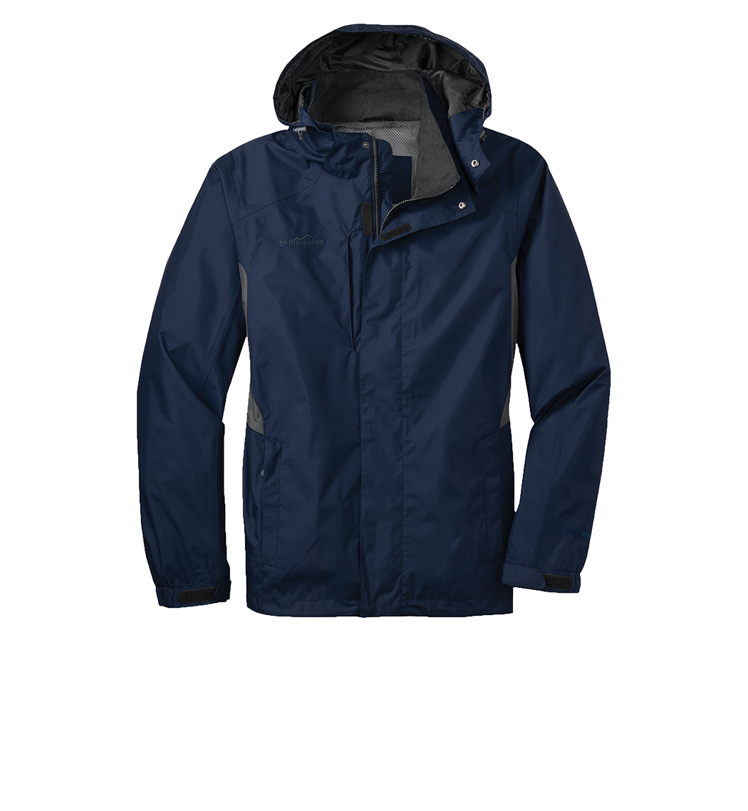 From misty mornings to evening downpours this fully seam-sealed completely waterproof colorblock jacket will help keep you dry warm and protected from whatever Mother Nature throws at you. Highly waterproof and breathable 5K/5K fabric. 5000MM fabric water protection rating 5000G/M2 fabric breathability rating detachable hood with locking drawcord for adjustability exterior storm flap with hook and loop closures Vislon zippered chest pocket front Vislon zippered pockets adjustable tab cuffs with hook and loop closures and an open hem with locking drawcord. Decoration access pocket. Embroidered Eddie Bauer contrast logo on right chest. WeatherEdge embroidered logo on left sleeve indicates reliable waterproofing and breathable technology. Polyester dobby shell mesh body lining 100% nylon accents.
