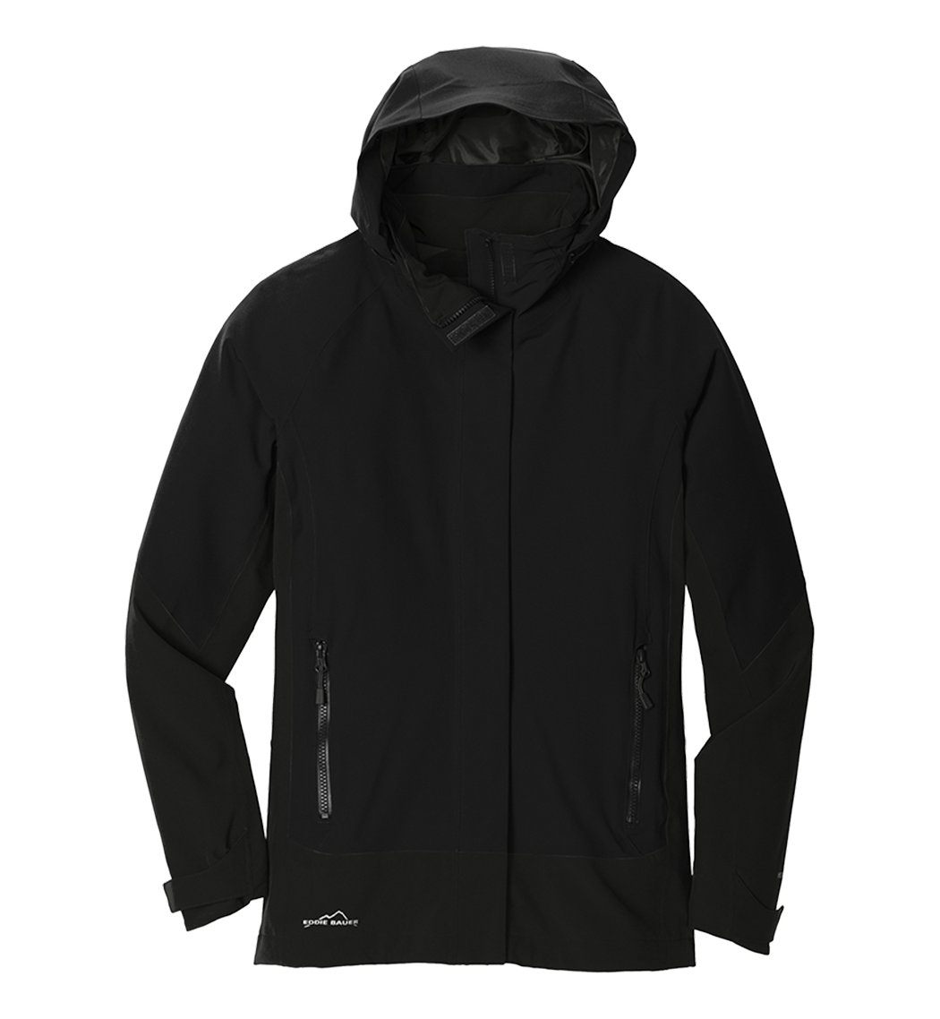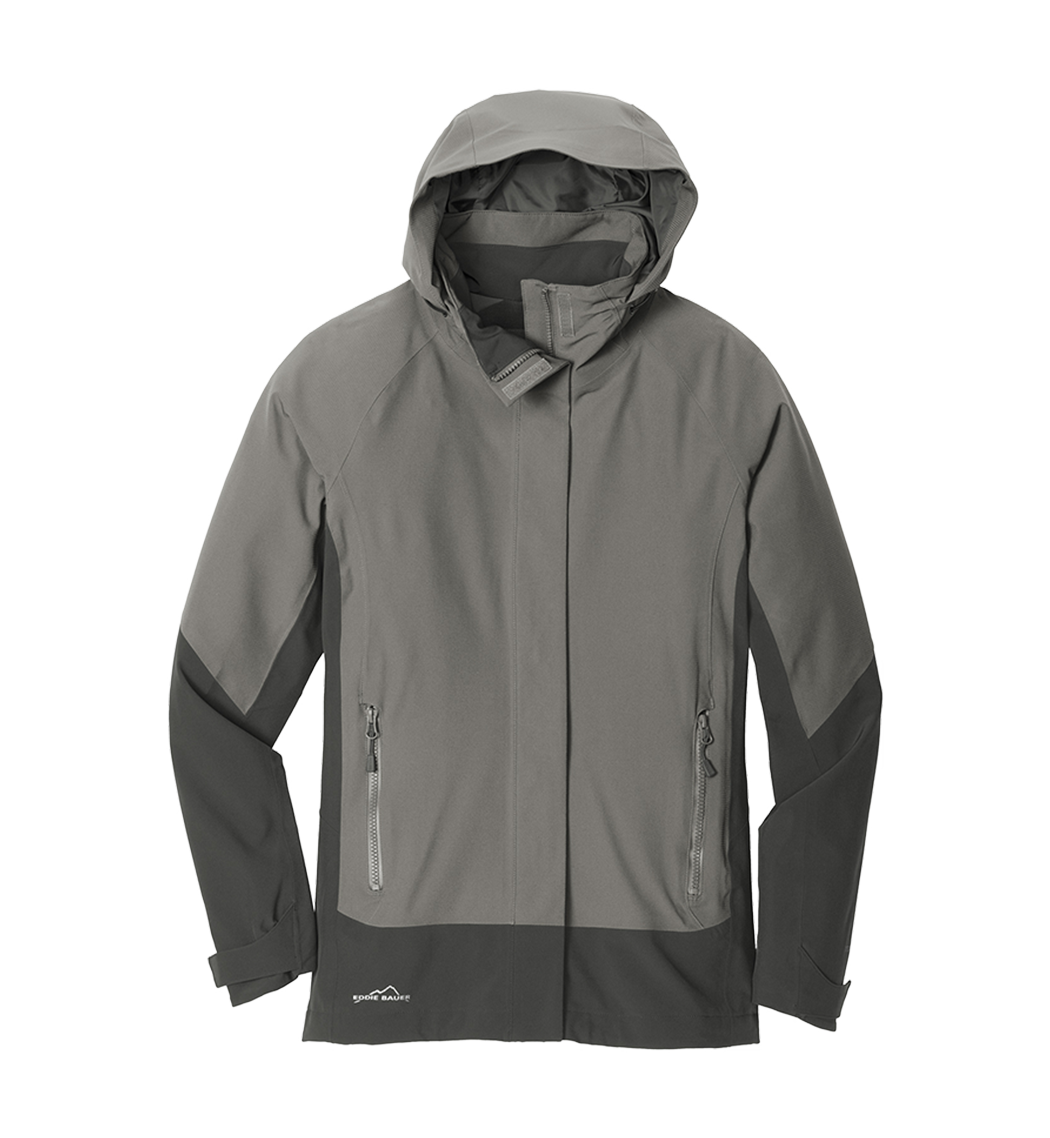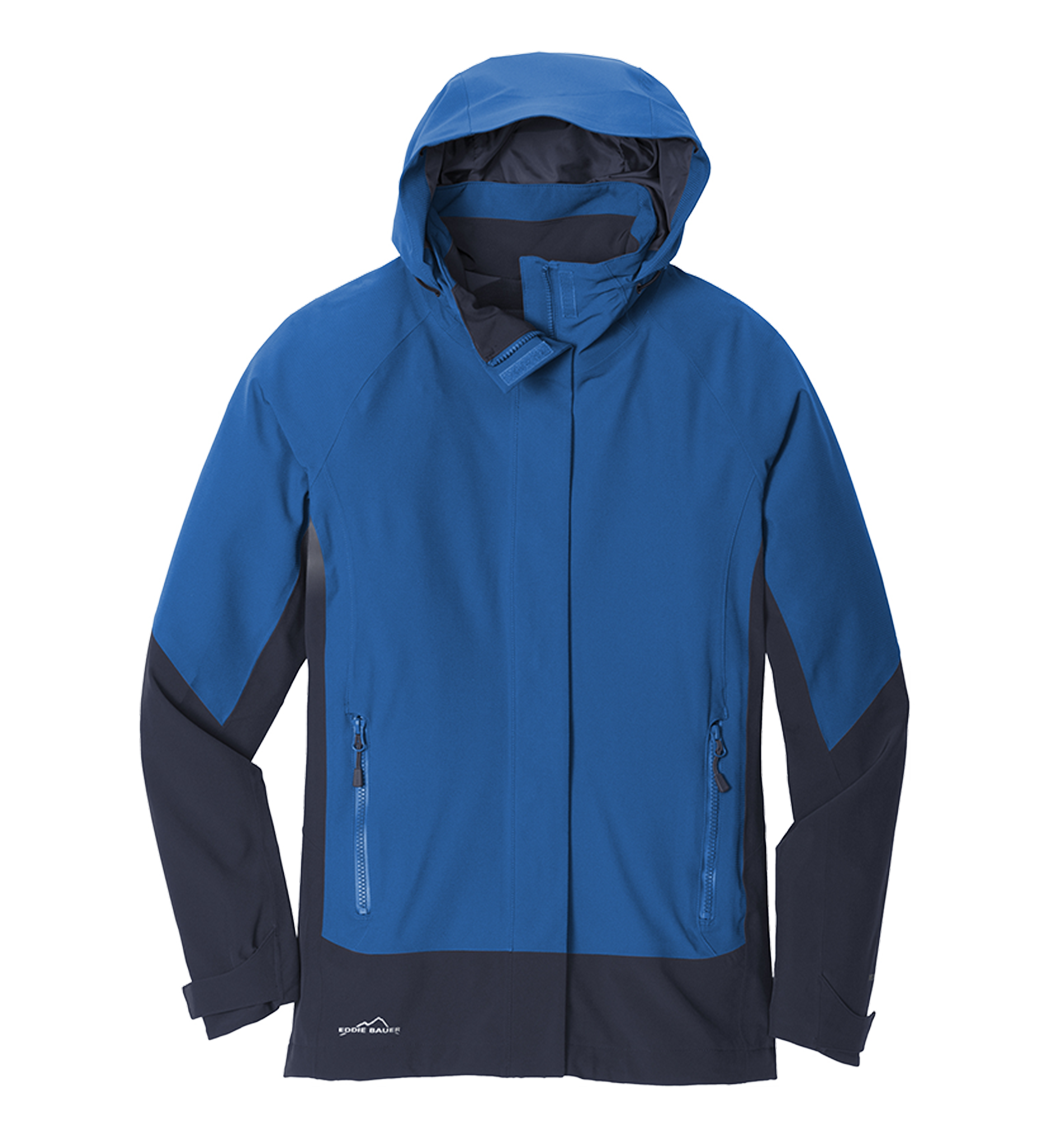Two element-fighting WeatherEdge 5K/5K fabrics come together in this jacket for highly waterproof breathable performance. Fully seam-sealed this jacket also features an exclusive StormRepel durable water-repellent (DWR) coating for additional weather protection. Four-way stretch for easy mobility. Adjustable hood with locking drawcord waterproof molded front zippered pockets adjustable tab cuffs with hook and loop closures. Decoration access pocket. Adjustable locking drawcord hem. Contrast WeatherEdge logo heat transfer on left sleeve. Contrast Eddie Bauer logo heat transfer on right hem. Made of 94/6 poly/spandex and 92/8 poly/spandex.