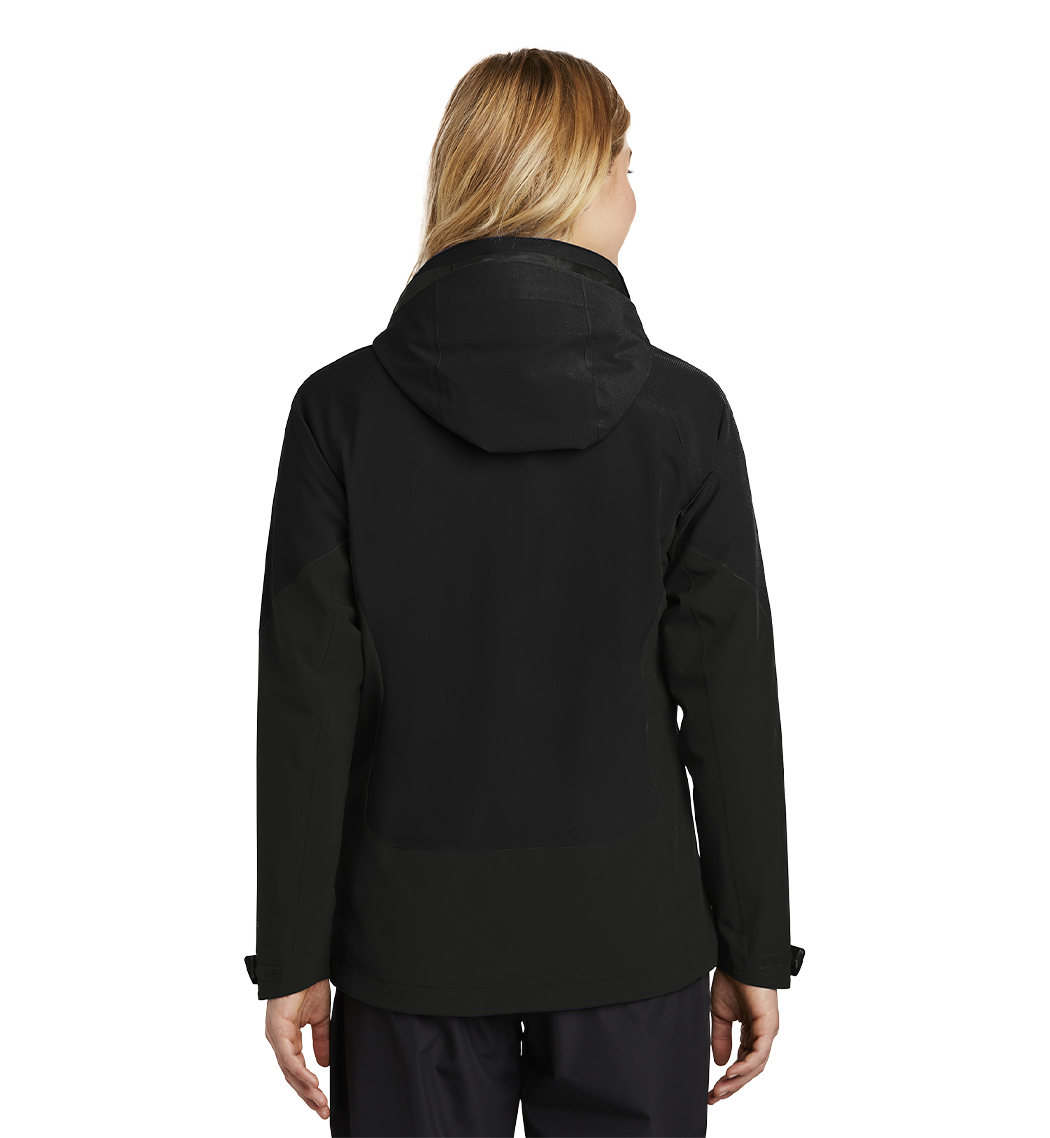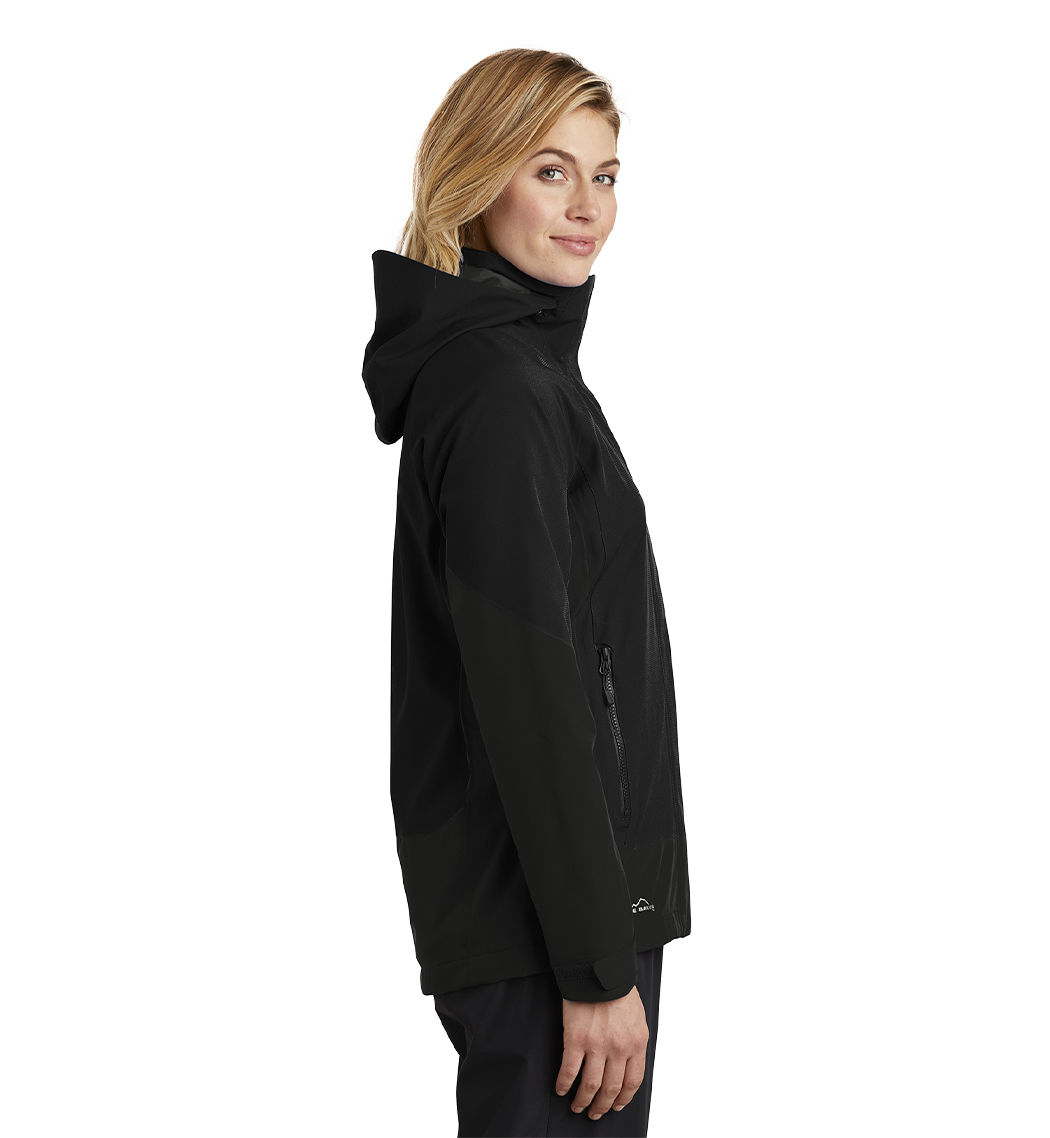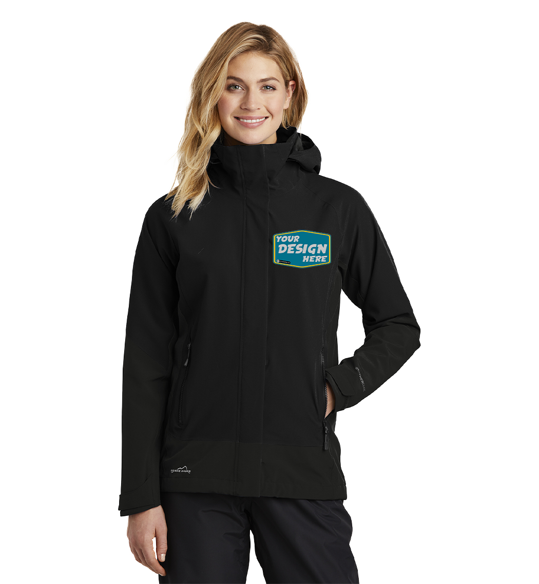 Two element-fighting WeatherEdge 5K/5K fabrics come together in this jacket for highly waterproof breathable performance. Fully seam-sealed this jacket also features an exclusive StormRepel durable water-repellent (DWR) coating for additional weather protection. Four-way stretch for easy mobility. Adjustable hood with locking drawcord waterproof molded front zippered pockets adjustable tab cuffs with hook and loop closures. Decoration access pocket. Adjustable locking drawcord hem. Contrast WeatherEdge logo heat transfer on left sleeve. Contrast Eddie Bauer logo heat transfer on right hem. Made of 94/6 poly/spandex and 92/8 poly/spandex.