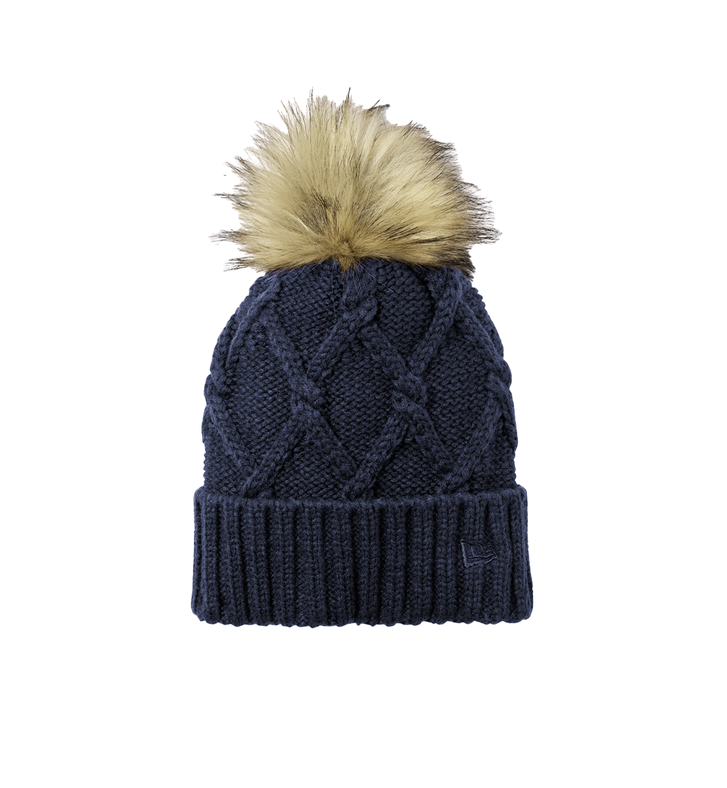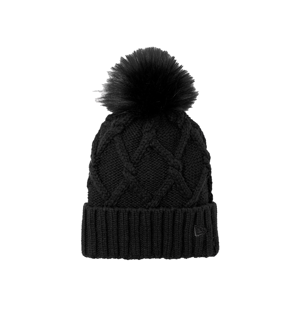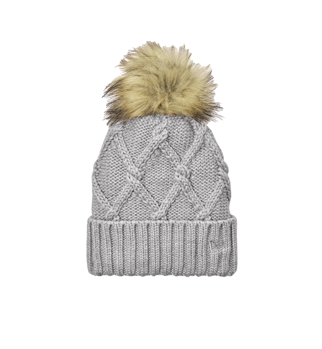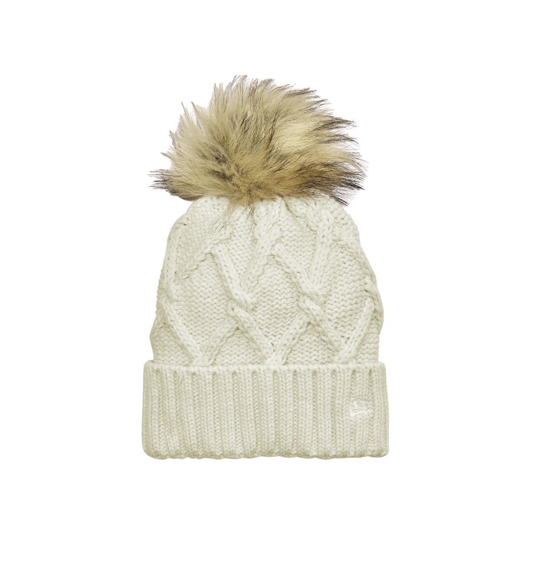 Totally on-trend, this ladies beanie has a thick ribbed cuff and a cable knit crown that’s topped off by a fun faux fur pom.