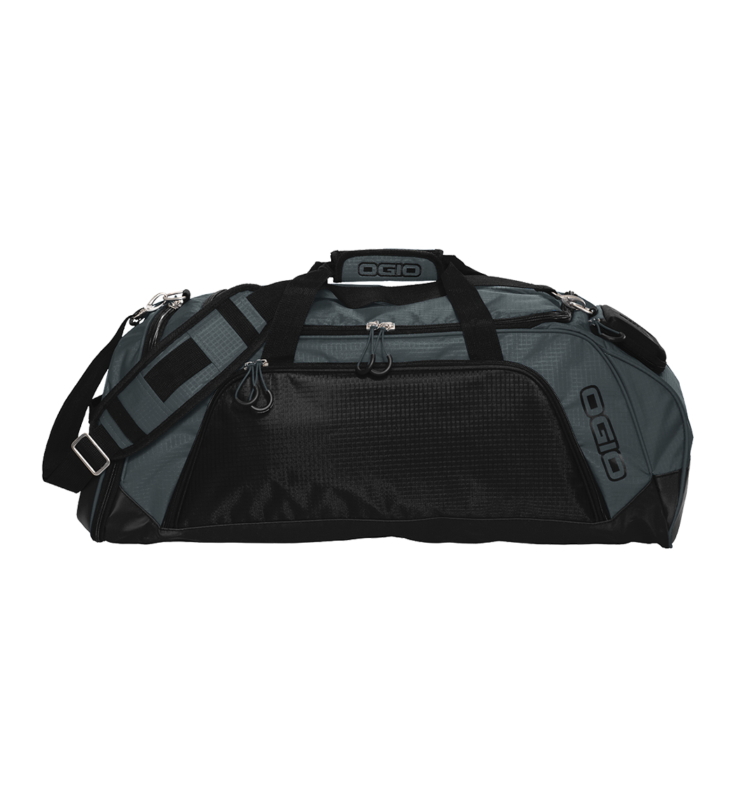 Easily transition from the gym to work (or even to the airport) with this durable duffel that features OGIO's protective Tech Vault and a water-resistant bottom.420D poly double ripstop with PVC 6P backing and water-resistant coating/900D poly reverse-faced TPE backing Large main compartment with U-shaped openingFront zippered pocket with divider mesh organization and side gussets/li>Crush-proof Tech Vault to protect glasses or valuablesSide-ventilated shoe pocketEasy-grab molded zipper pullsDetachable adjustable shoulder strapPadded carrying handles with hook and loop closure and OGIO logoSide webbing handleDurable water-resistant bottomDimensions: 27 h x 14.5 w x 12 d Capacity: 3 700 cu.in./61LWeight: 2.3 lbs./1.1kgNote: Bags not intended for use by children 12 and under.