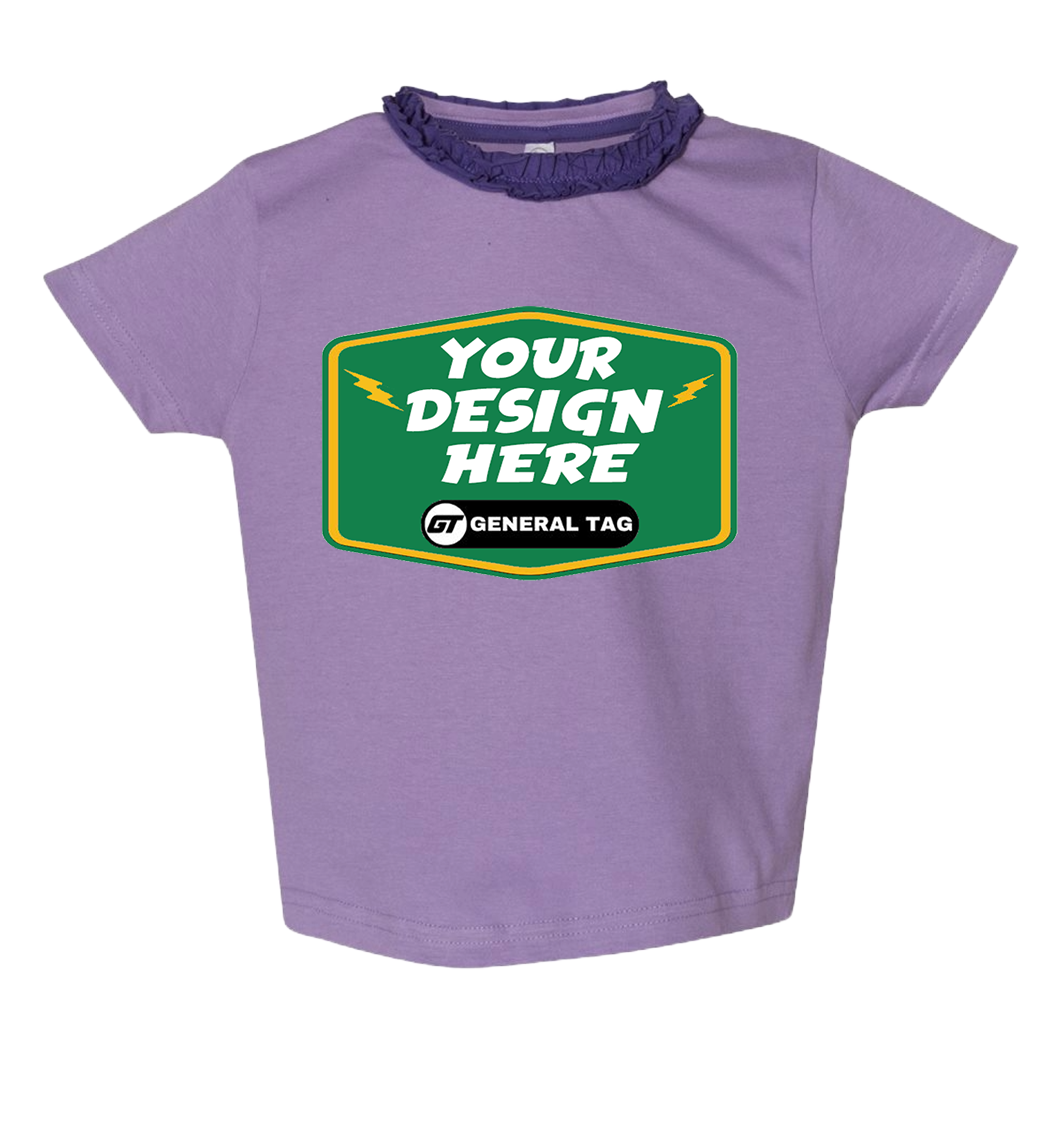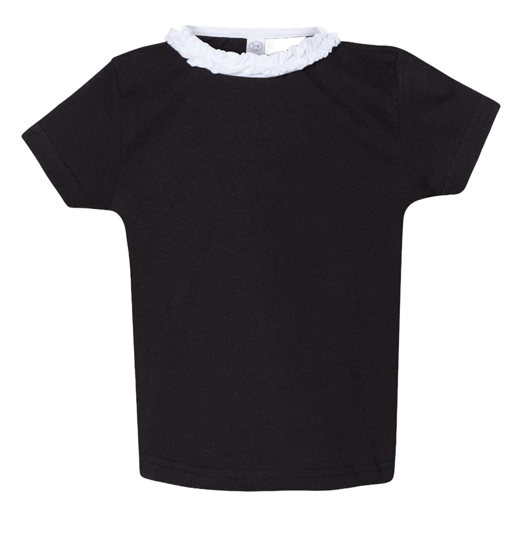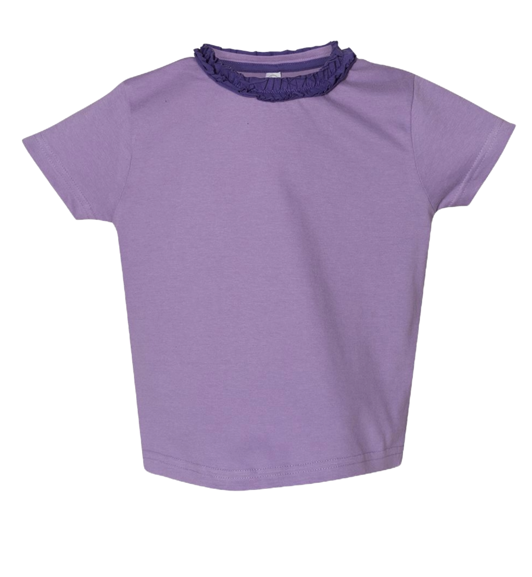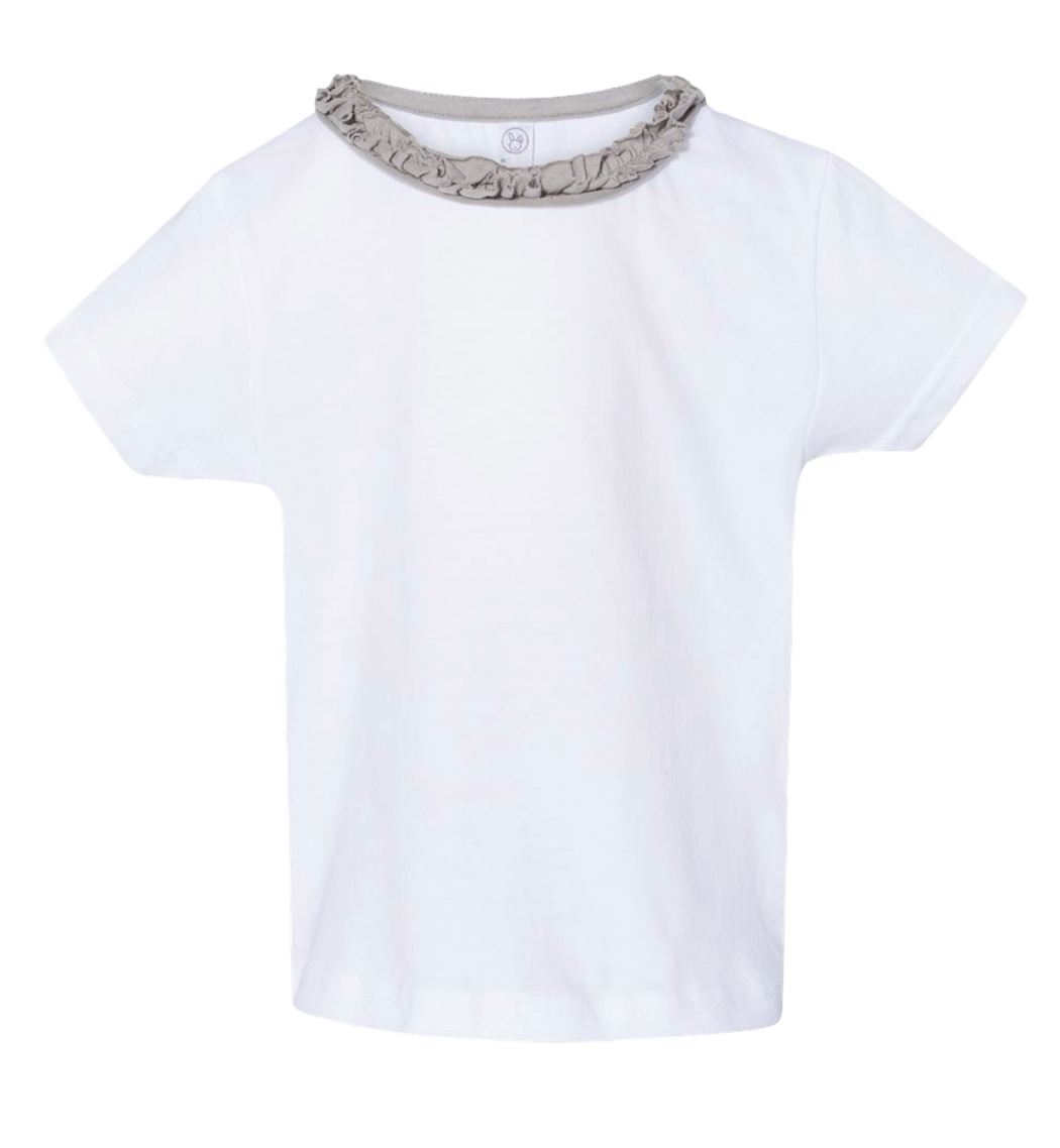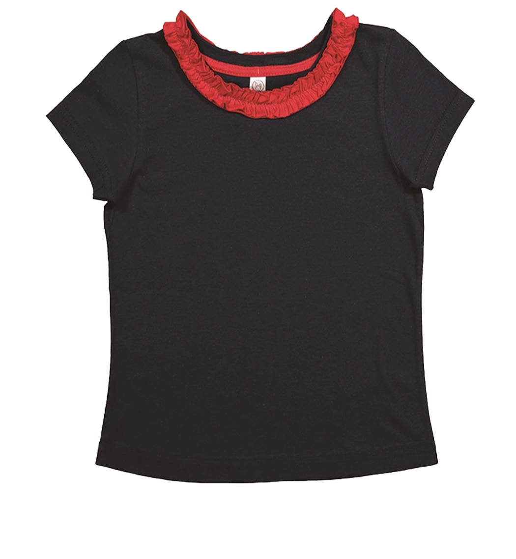 Self-fabric contrast-color ruffle trim is applied with elastic thread for comfort and stretch